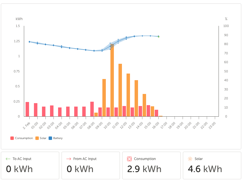 Tagesbilanz: Verbrauch (Insel 2): 2.9kWh / 16h = 0.181kW in 16h --> in 24h: 4.35kWh, PV-Ertrag: 4.6kWh