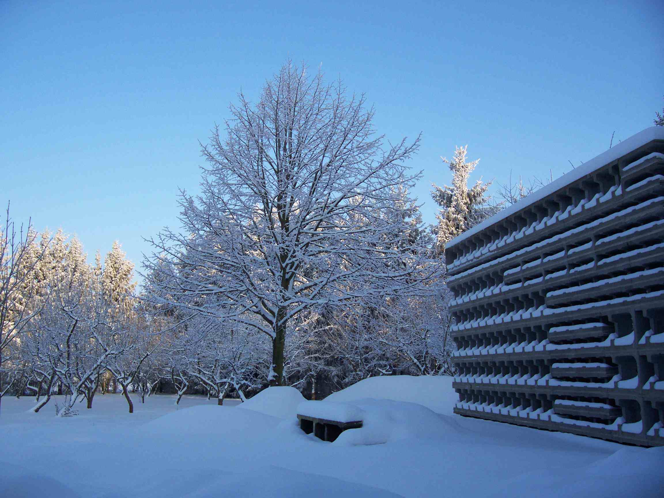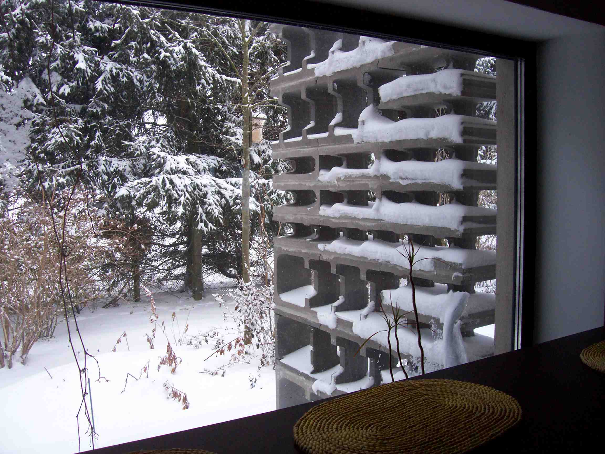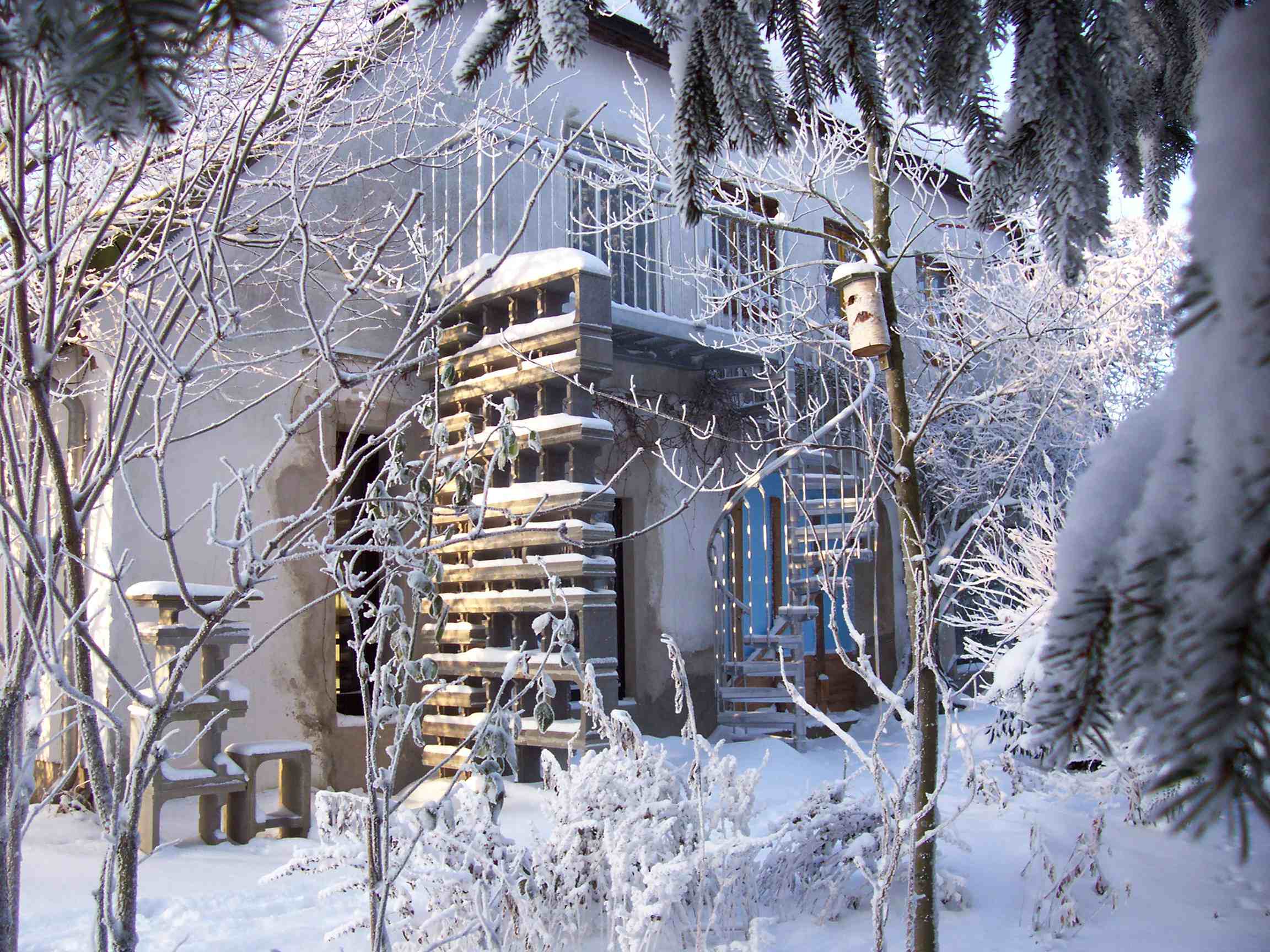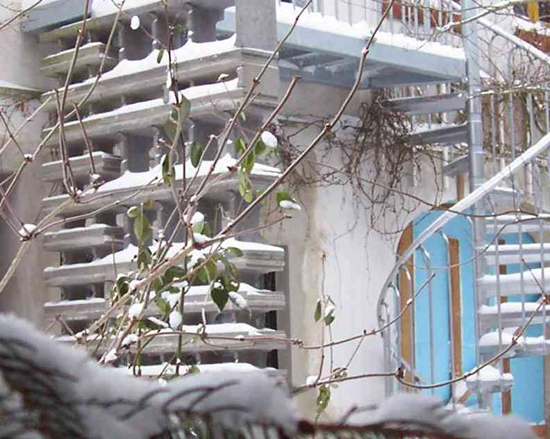No doubt we love our "sculpture walls", particularly now with snow on them. Our disorderly attic (simulataneously library, bedroom and construction material storage) has no heat insulation, and therefore we redesigned its entrance: It's now from the outside, so we don't loose heat any longer through a staircase in our hallway leading up to it. The wall in the fourth photograph will be part of a design to come.