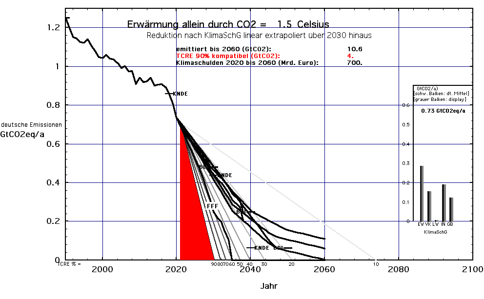Beachten: Die grauen Balken im Einschub rechts geben die Startdaten (Jahr 2020) fŸr den rot eingezeichneten Fridays-For-Future-Reduktionspfad. non-EW ist die Summe der im Balkendiagramm grau eingezeichneten Sektoren Verkehr (VK), Landwirtschaft (LW, hier = 0, weil im wesentlichen nicht-CO2-Emissionen), Industrie (IN) und GebŠude (GB).