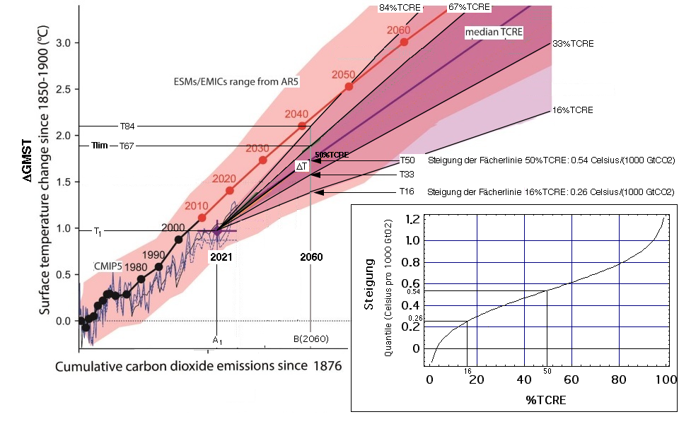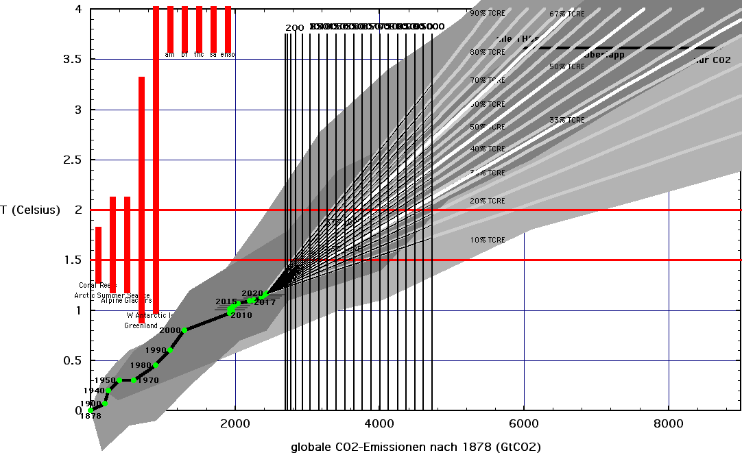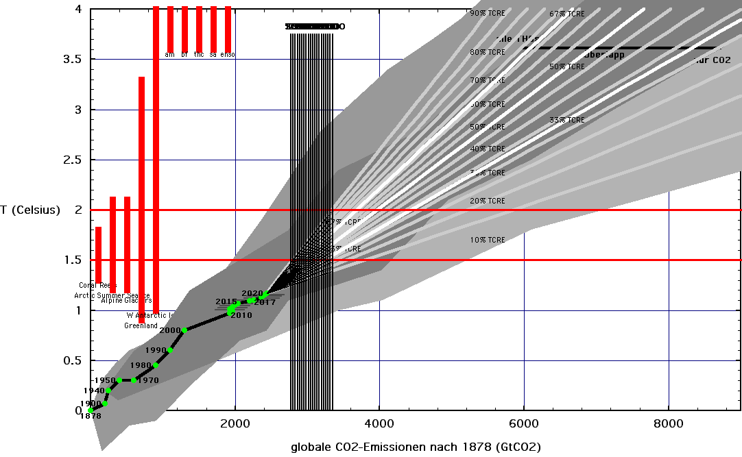 - Ebenso wird weithin implizit ein vereinfachtes Klimamodell (TCRE) verwendet, mit dem man aus den CO2-Budgets die globale Erhšhung der Global Mean Surface-near Temperature (ΔGMST) berechnet. (Vergleich von TCRE (hellgrauer FŠcher) mit Equilibrium Climate Sensititivity, ECS (schwarzer FŠcher)).