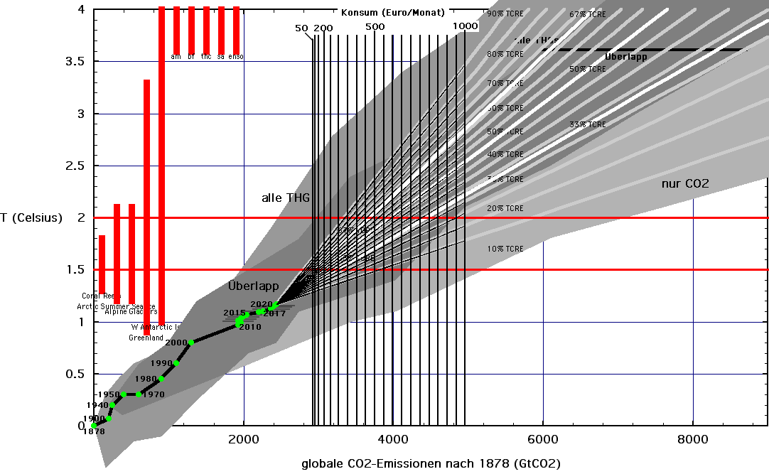 - fŸhrt nach 90%TCRE bis zu einer ErderwŠrmung Tlim = 3.5 Grad Celsius, d.h. das TCRE-Modell (unser grober "Klimasimulator") warnt uns, dass es bei 4 Jahrzehnten monatlichen "sonstigen Konsums" von 1000 Euro pro Person