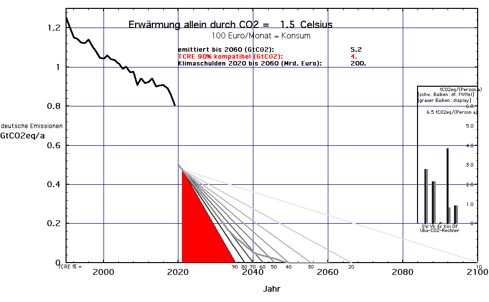 - Und quantitativ: Wir kšnnen leicht durch verantwortliche MobilitŠt und "sonstigen Konsum" (wie er vom Uba-CO2-Rechner definiert wird) das Pariser 1.5-Grad-Ziel einhalten, was das Klimaschutzgesetz ohne unsere Mithilfe nicht schafft.