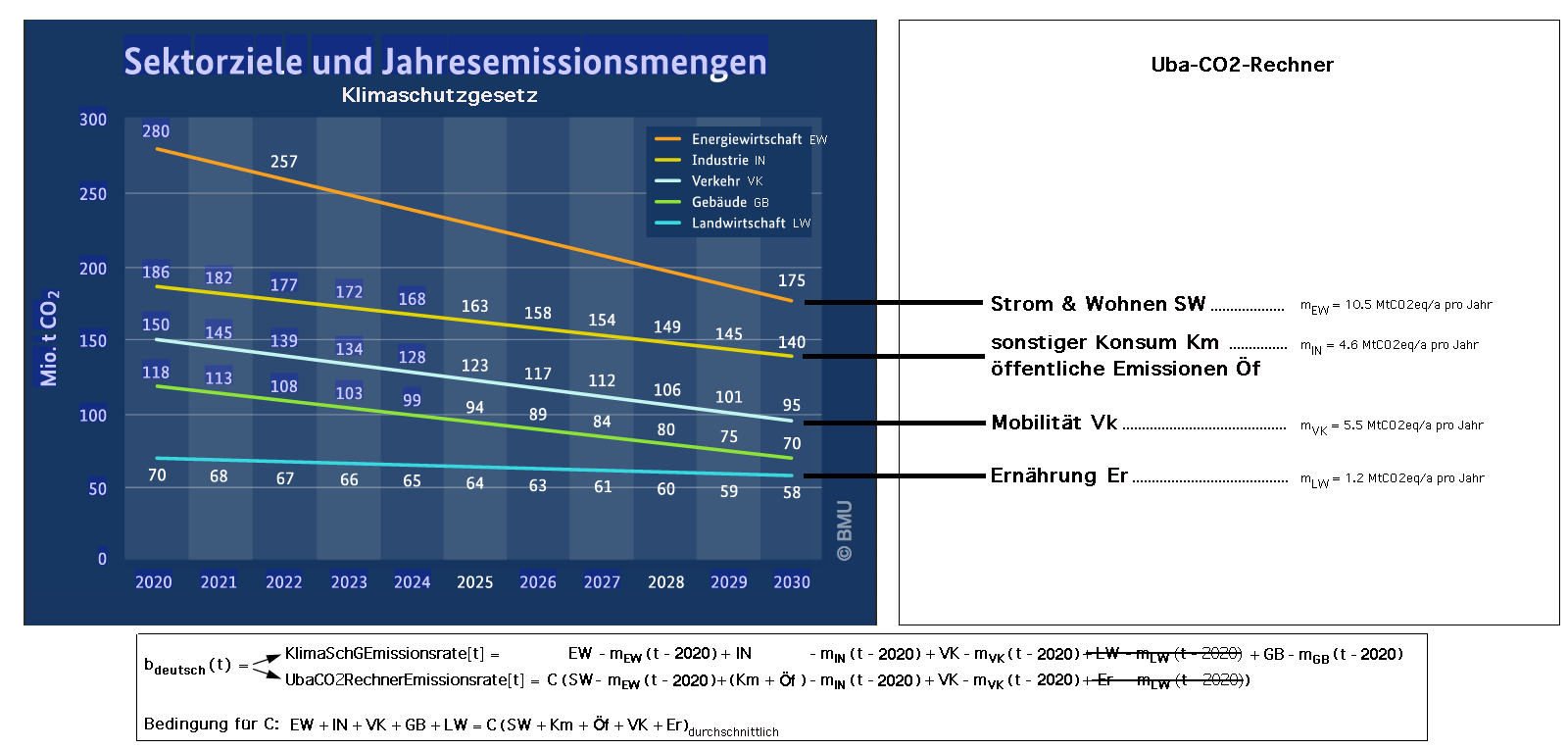 - Die durchschnittlichen privaten Emissionen UbaCO2RechnerEmissionsrate[2020] multipliziert mit der deutschen Einwohnerzahl (hier angenommen: 80 Millionen Personen) ergeben definitionsgemЧ die Treibhausgasemissionen ganz Deutschlands bdeutsch(2020) = KlimaSchGEmissionsrate[2020] (auf 3% genau, das berŸcksichtige ich im Faktor C in der Abbildung 5).